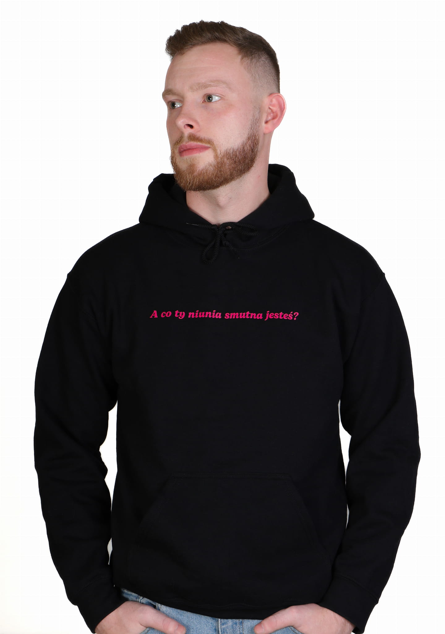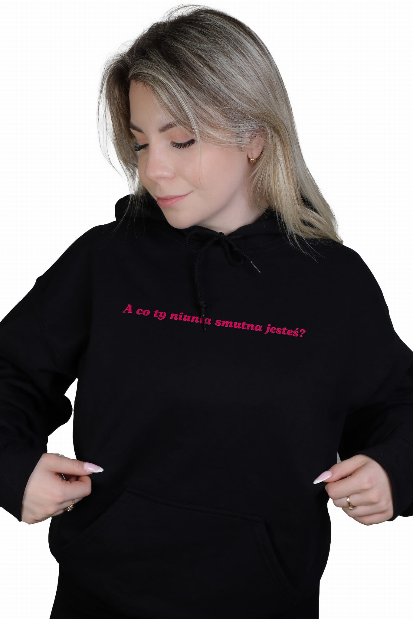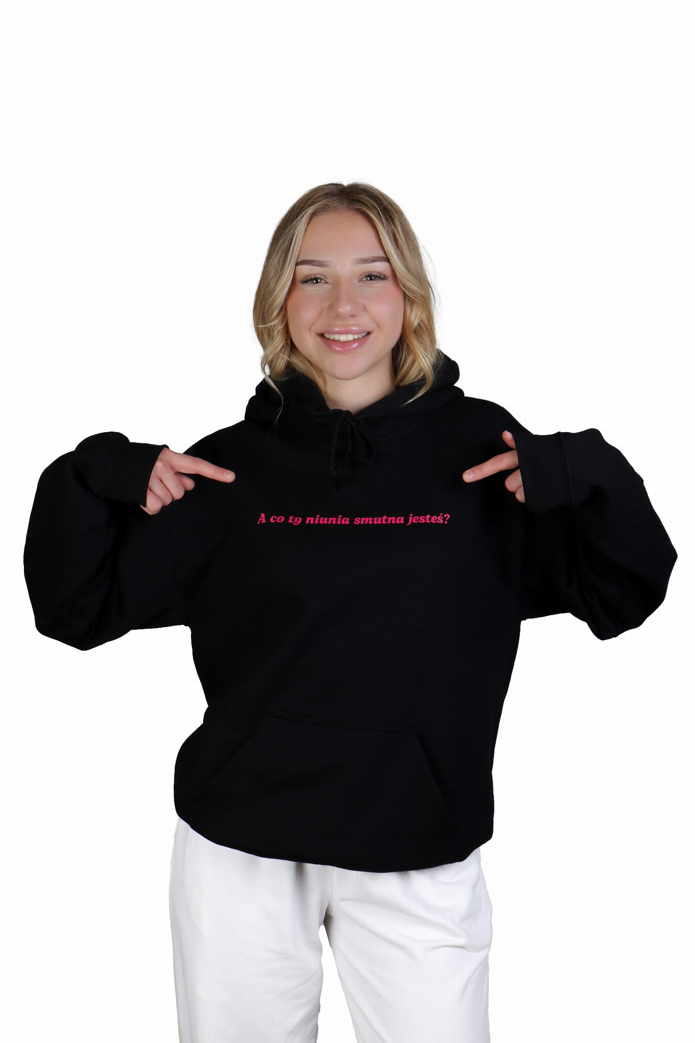 Czarna bluza z kapturem Pani Fotograf to połączenie wygody, stylu i odrobiny humoru. Na przodzie bluzy znajduje się różowy nadruk: